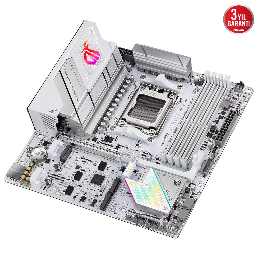 ROG Strix B850-G, tüm PC sistemlerine uyum sağlayan ve sağlam bir tarz ortaya koyan beyaz PCB’ye sahip. Bu görünüm, metal soğutma bloklarıyla birleştiğinde cesur ve saf bir estetik sunarken, G/Ç kenarındaki RGB, sade veya canlı tarz arasında seçim imkanı sunar.